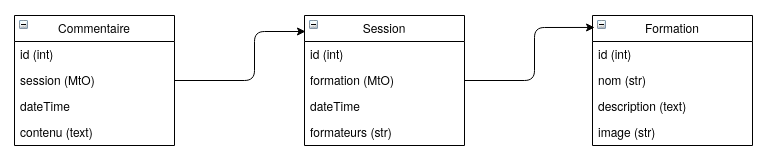 Ce site est le back-end de l'application que vous allez développer lors de la formation DevMobile du GInfo. Vous pourrez y réccupérer toutes les informations à afficher dans l'application. Les données sont organisées comme ceci : Il y a des formations, qui ont chacune des sessions, qui ont des commentaires.